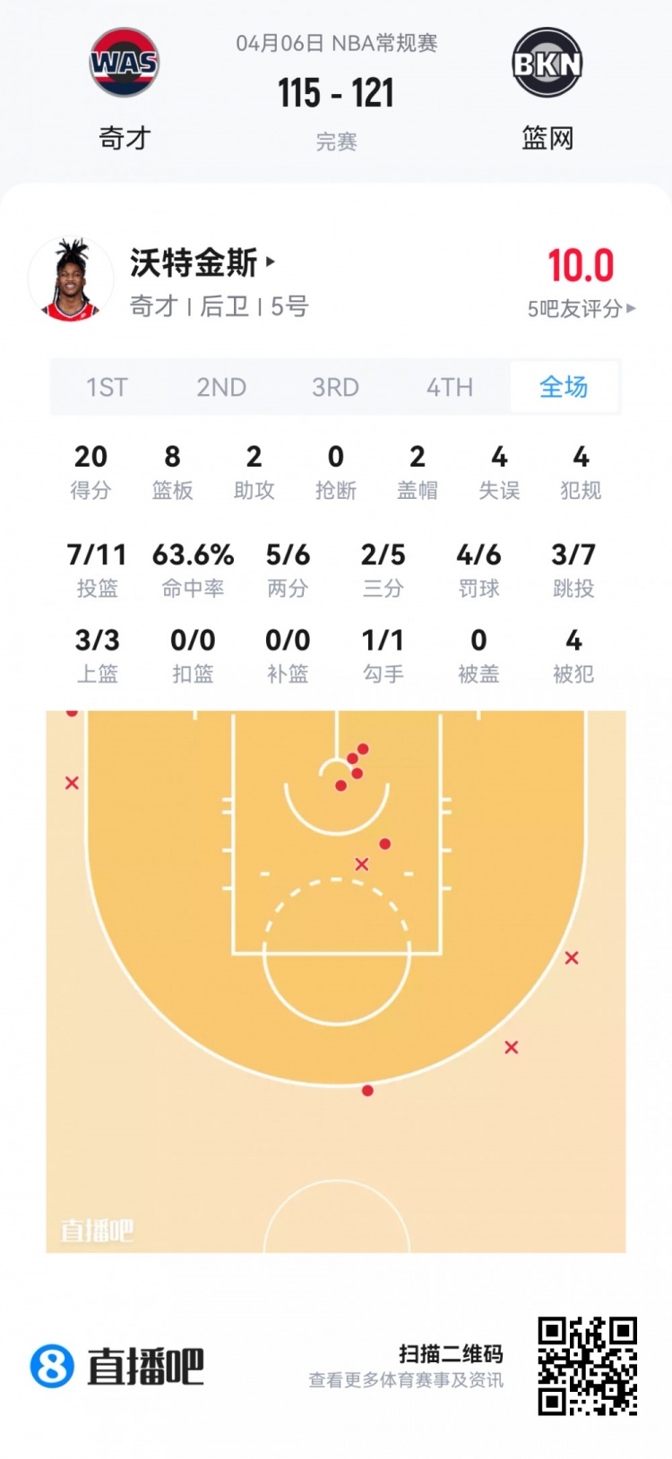 奇才次轮43号秀沃特金斯 登场43.7分钟